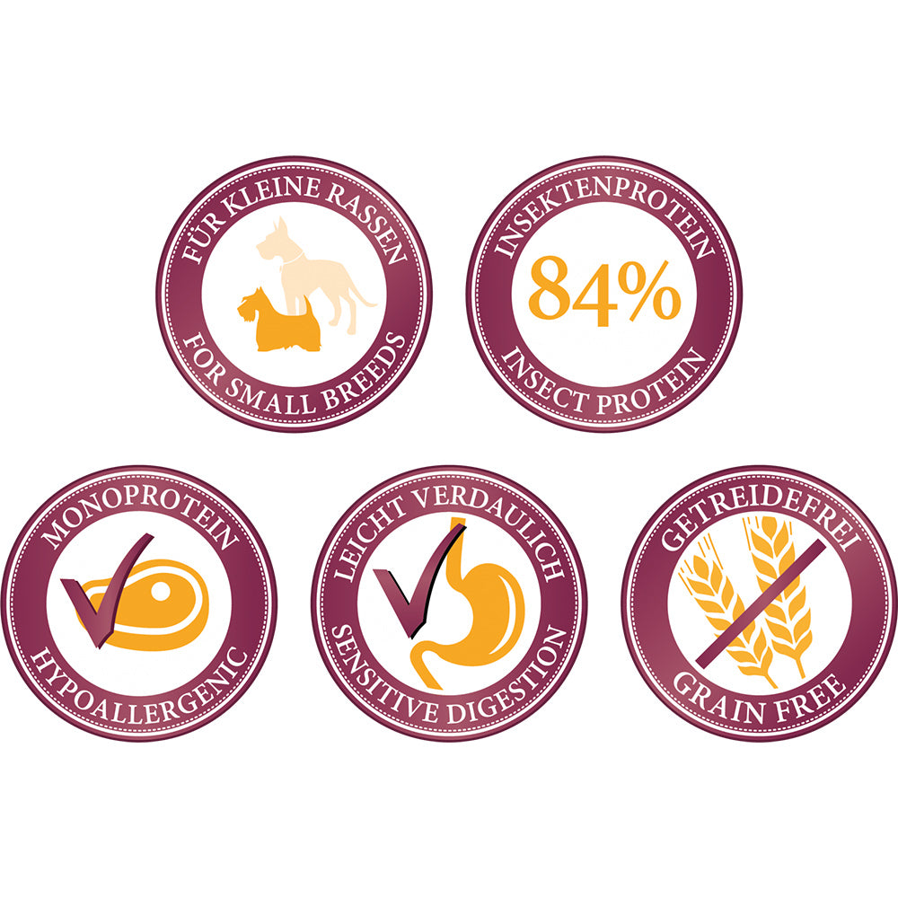 Häufig sind tierische Proteine wie Rind, Geflügel oder Schwein die Auslöser von Allergien. Das Insektenprotein der Schwarzen Soldatenfliege (Hermetia illucens) gilt als hypoallergen, wird hervorragend vertragen und besitzt eine hohe biologische Wertigkeit, ein ausgewogenes Aminosäurenprofil und ein sehr geringes Allergiepotenzial. So können auch ernährungssensible kleine Hunde zuverlässig mit allen wichtigen Proteinen versorgt werden.