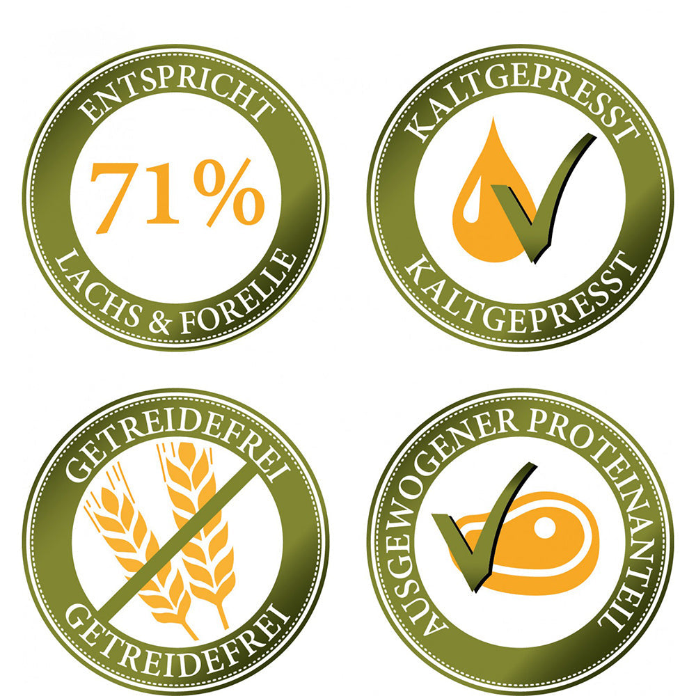 Kaltgepresstes, getreidefreies Trockenfutter mit Lachs und Forelle für grosse Hunde