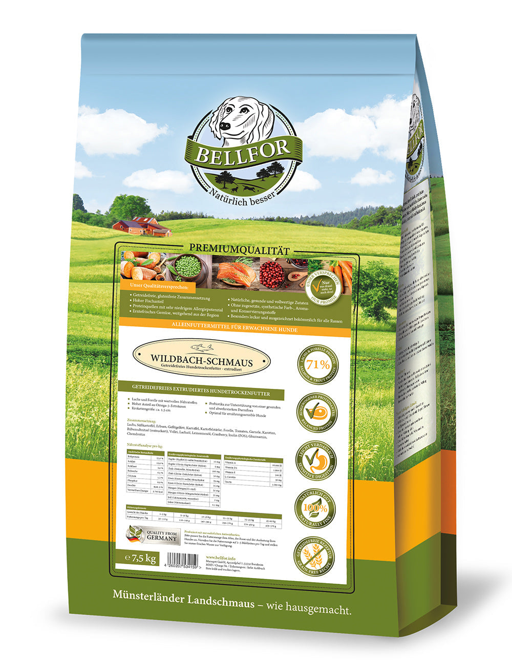 Bellfor Qualitätsversprechen: Bellfor steht seit mehr als 30 Jahren für hochwertige, artgerechte Hundenahrung. Wildbach-Schmaus wird nach höchsten Qualitätsstandards in Deutschland produziert und vereint die besten Zutaten aus natürlichen Wildgewässern mit nachhaltigen, natürlichen Inhaltsstoffen.