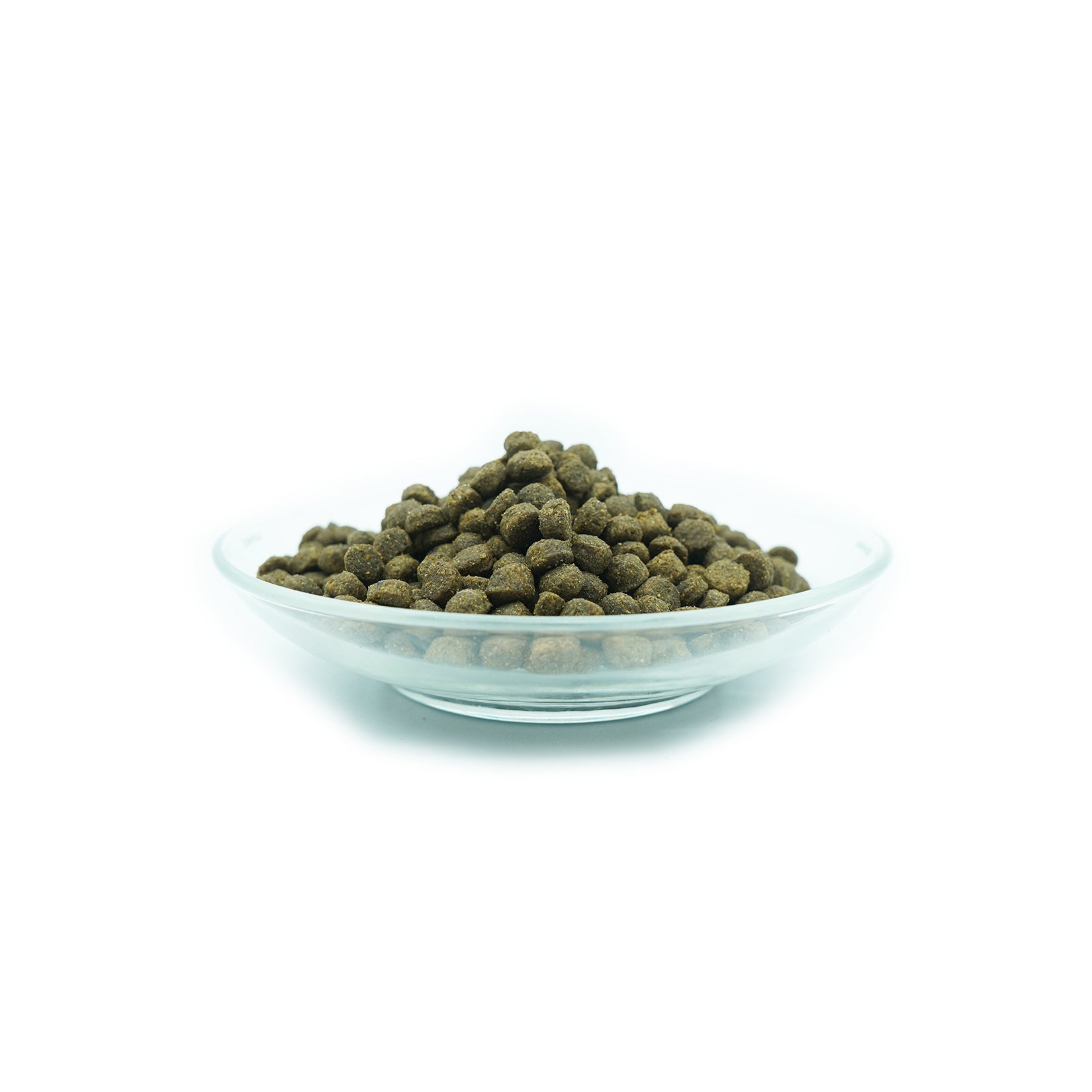 Getrocknete Insekten (Schwarze Soldatenfliege) (29%), getrocknete Süßkartoffel (19,7%), Erbsen (17,5%), tierisches Fett, Erbseneiweiß, Bierhefe, Mineralstoffe, getrocknete Tomate (2%), getrocknete Karotte (1%), Lachsöl, Leinsamenöl, Cranberry (0,2%), Inulin (Quelle für FOS)
